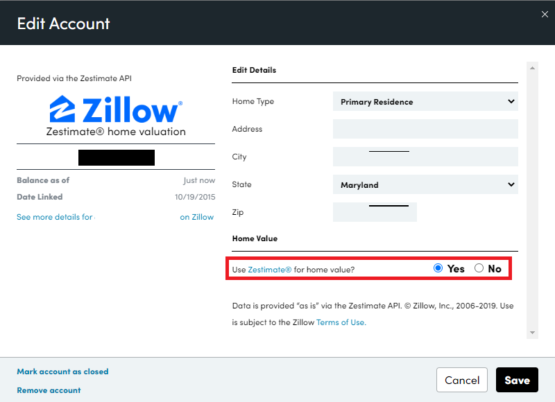 I don’t want my perspective on our net worth affected by our home’s “value.” I just assume it has held the value we assigned at purchase. They have a feature where you can tie in a Zillow estimate (Zestimate), but I don’t use it.