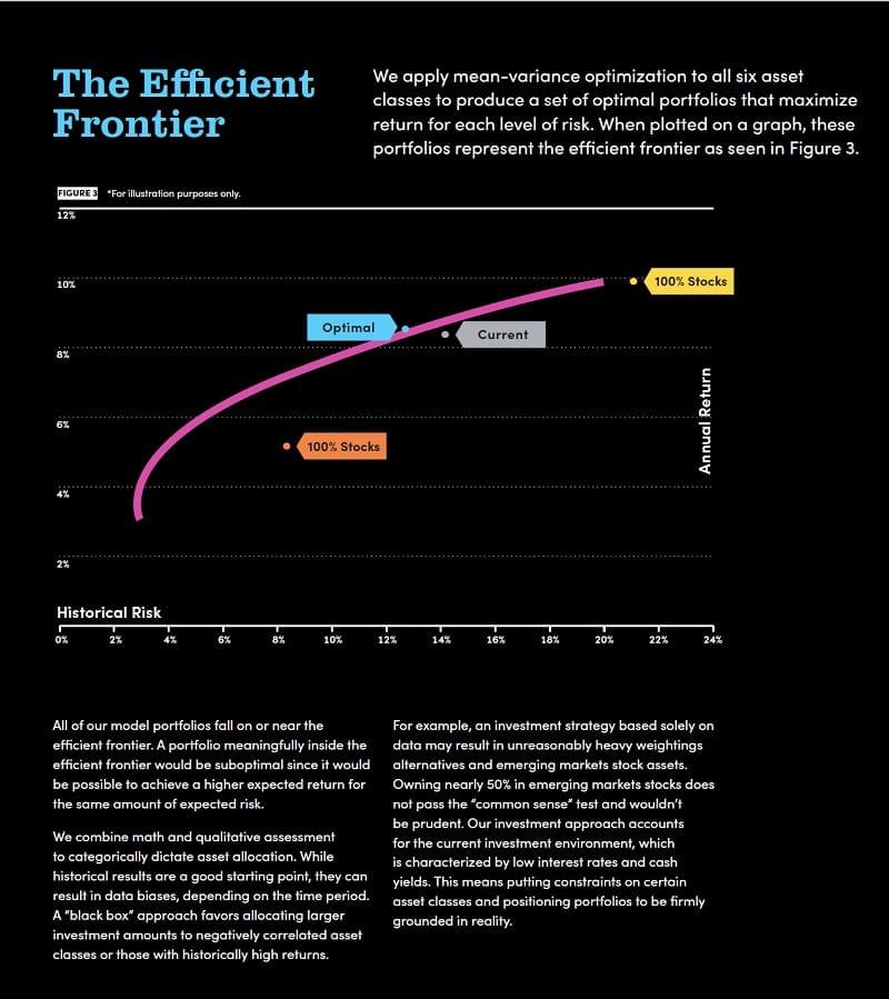 There’s this idea of an efficient frontier – where you can maximize returns for that level of risk. The more risk you take, the higher the potential returns. But you want to get an asset allocation that maximizes your return for YOUR level of risk. If you don’t, you’re leaving money on the table.