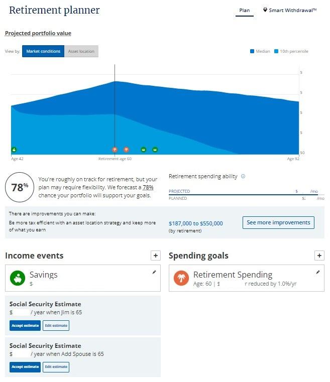 The platform takes your income sources and retirement needs to chart it all out for you. If you hit the age when you need to take Requirement Minimum Distributions (RMD), then the tool will take that into account as well.