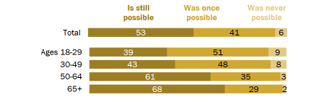 Those under 30 and those with a low income have the same results with 51% believing it is no longer possible, but once was. However, only about a third of those over 65 and those with a high income believe it was once possible.