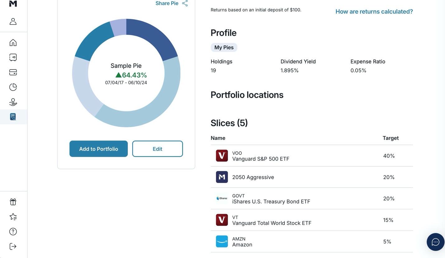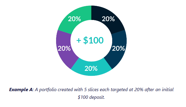 Your pie will have as many as 100 different components, or “slices.” Each slice can be an ETF, a stock, or even another pie with a minimum 1% target allocation.