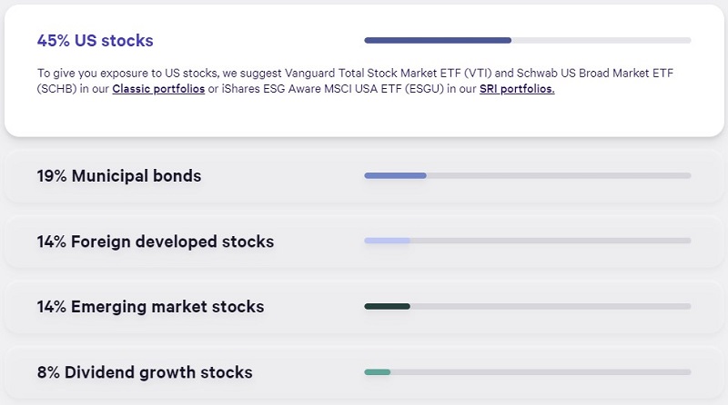 Wealthfront has three premade portfolios to choose from, but each can be easily customized. In total, it offers 239 investments, 17 asset classes, and two cryptocurrency trusts.