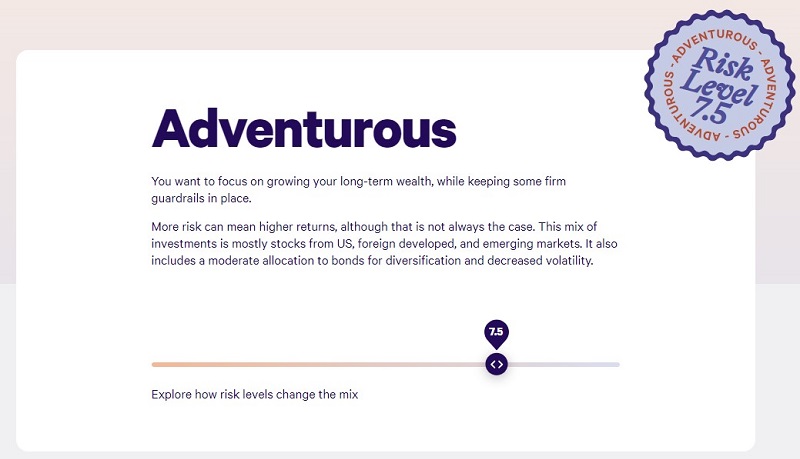You can play around with the Risk Tolerance slider to see how the allocations change (the portfolio is 7.5, the max is 10), plus see the difference between a Taxable Investment Mix and a Retirement Investment Mix. I like that the Projected Performance is a spread versus a single line as it’s often depicted because it more accurately reflects the data.